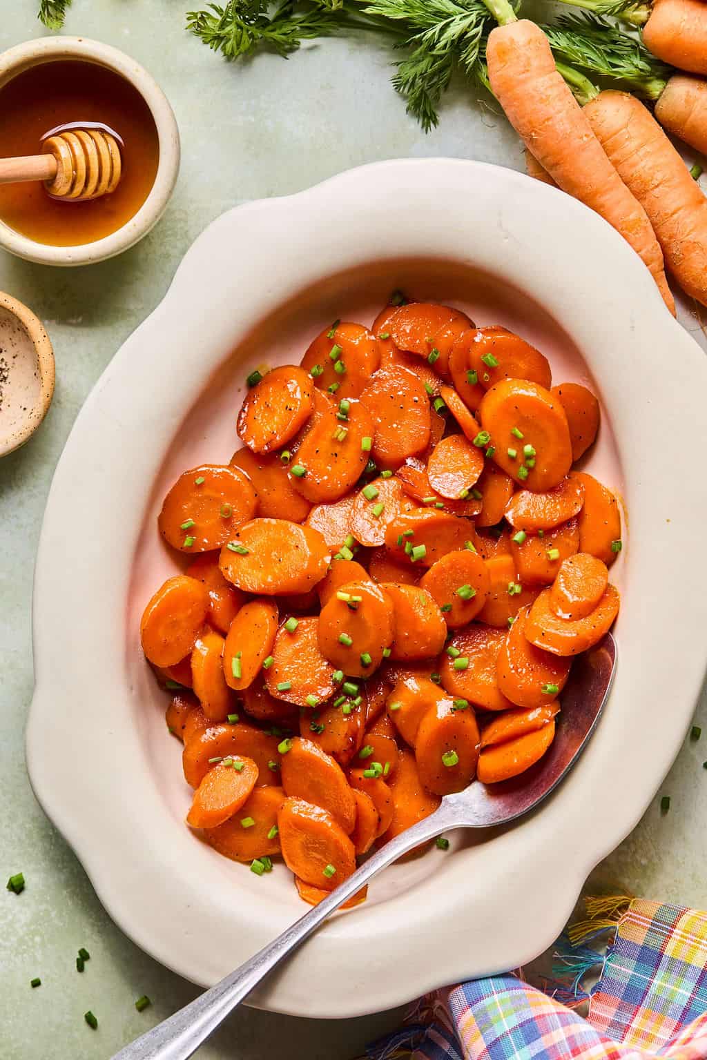 Tender carrots are coated in a glossy honey-butter glaze and topped with fresh herbs for flavor.